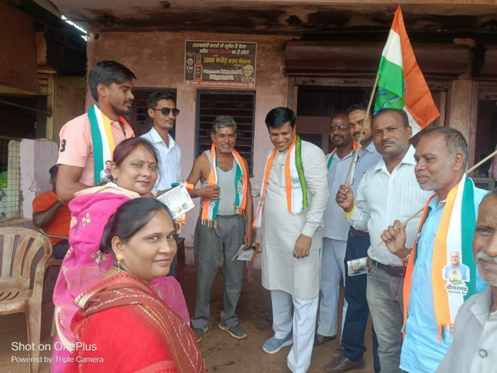 ????डोंगरगढ़ विधायक भुनेश्वर बघेल चुनाव नजदीक आते ही ग्रामीण क्षेत्रों में तिरंगा यात्रा निकालकर जनसंपर्क कर रहे है और अपनी पार्टी का गमछा भेंट कर जनाधार बढ़ाने की कोशिश कर रहे हैं। तिरंगा यात्रा ग्राम घुमका पहुँचने पर घुमका क्षेत्र के जनपद सदस्य एवं बीजेपी नेता दिलीप पटेल को भी गमछा भेंट करते उनकी फोटो लेकर मोबाइल में वायरल किया गया।