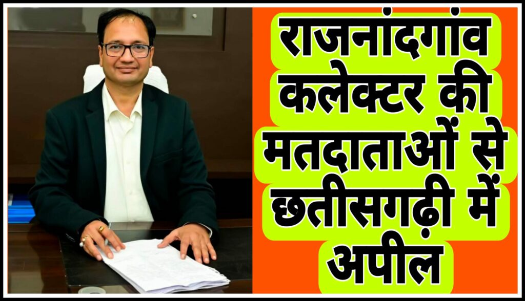 ????राजनांदगांव 25 अप्रैल 2024। कलेक्टर व जिला निर्वाचन अधिकारी संजय अग्रवाल ह छत्तीसगढ़ी भाखा म जिला के जम्मो मतदाता मन ला मतदान करे बर अपील करे हे। कलेक्टर संजय अग्रवाल हा अपन संदेश म कहिस जय जोहार… सब्बो मतदाता भाई-बहिनी मन ला सुरता देवात हो शुक्रवार 26 अप्रैल 2024 के हमर चुनई तिहार के दिन हवे।