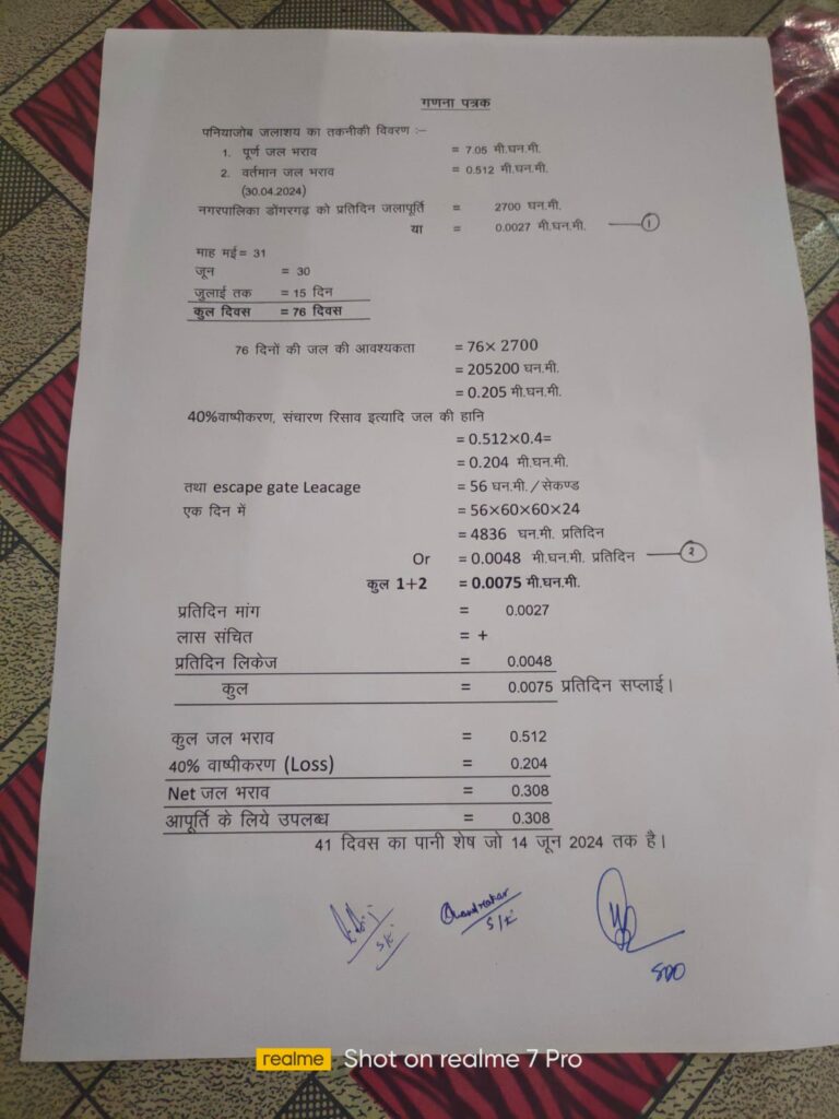 ????जलाशय का पूर्ण जल भराव 7.05 मीटर घन मीटर होता है जबकि 2 मई की स्थिति में मात्र 0.512 मीटर घन मीटर पानी है और डोंगरगढ़ शहर को प्रतिदिन 0.0027 मीटर घन मीटर पानी की सप्लाई की जाती है। उस हिसाब से लगभग 30 दिन ही पेयजल आपूर्ति की जा सकती है।