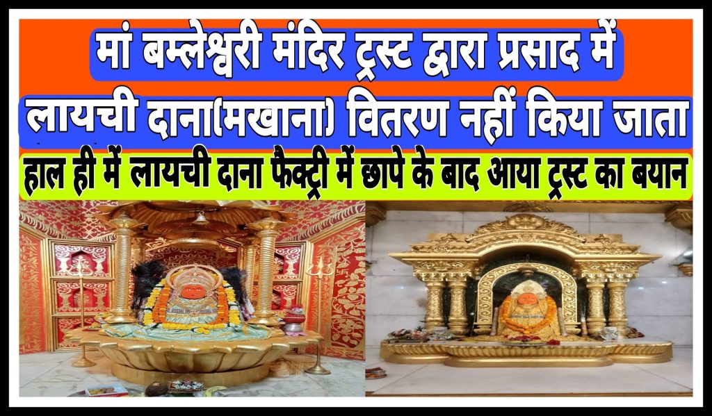 ????धर्मनगरी डोंगरगढ़ शहर से 5 किलोमीटर दूर स्थित लायची दाना (मखाना) फैक्टरी पर छापे और कार्यवाही के बाद कुछ लोगों द्वारा मां बम्लेश्वरी मंदिर में हो रहे प्रसाद वितरण के विषय में झूठी अफवाहें फैलाई जा रही है। इस संबंध में प्रेस विज्ञप्ति जारी कर मंदिर ट्रस्ट के अध्यक्ष मनोज अग्रवाल ने कहा कि मंदिर ट्रस्ट द्वारा किसी भी लायचीदाना (मखाना) फैक्टरी से खरीदी नहीं की जाती, वर्ष भर दर्शनार्थियों द्वारा चढ़ाये गये नारियल को ही प्रसाद स्वरूप वितरित किया जाता है और जब नवरात्र पर्व के दौरान मंदिर परिसर में नारियल फोड़ना प्रतिबंधित होता है तो प्रसाद में मिश्री दाने का वितरण किया जाता है। इस संबंध में यह जानकारी देना भी आवश्यक है कि मंदिर ट्रस्ट द्वारा उच्च क्वालिटी का मिश्री दाना खरीदी कर स्वयं के पैकिंग मशीन से मंदिर परिसर में ही पैकिंग कर प्रसाद स्वरूप वितरित किया जाता है।