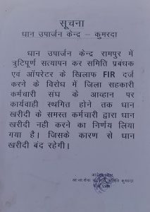 ????डोंगरगांव विकासखंड अंतर्गत रामपुर सेवा सहकारी समिति में बीते दिनों 3 जनवरी को खाद्य विभाग की संयुक्त टीम द्वारा दोषपूर्ण कार्यवाही कर 6768 बोरी धान की फर्जी खरीदी का मामला बनाकर सोसाइटी प्रबंधक पर कार्यवाही किए जाने के विरोध में जिला सहकारी कर्मचारी संघ के आव्हान पर राजनांदगांव जिले के समस्त 96 सेवा सहकारी समिति के प्रबंधक लिपिक चौकीदार कंप्यूटर ऑपरेटर ने धान खरीदी बंद कर सामूहिक इस्तीफा देने का निर्णय किया है। आज दिनांक 9 जनवरी से जिले की सभी सोसाइटी में धान खरीदी बंद कर दी गई है।
