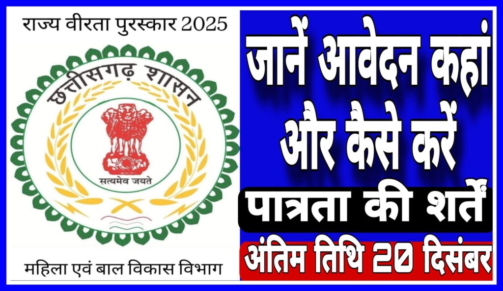 🔴राजनांदगांव- छत्तीसगढ़ शासन द्वारा राज्य वीरता पुरस्कार 2025 के लिए पात्र बालक-बालिका 20 दिसम्बर 2025 तक कार्यालय जिला कार्यक्रम अधिकारी महिला एवं बाल विकास विभाग राजनांदगांव में आवेदन प्रस्तुत कर सकते है।