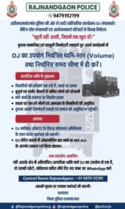 🔴राजनांदगांव- जिला पुलिस प्रशासन ने शादी / पारिवारिक कार्यक्रम / DJ संचालकों / मैरिज हॉल संचालकों एवं आयोजनकर्ता परिवारों से विनम्र निवेदन किया है कि कृपया सामाजिक एवं कानूनी जिम्मेदारी समझते हुए अपने कार्यक्रमों में DJ का उपयोग नियंत्रित ध्वनि-स्तर (Volume) तथा निर्धारित समय सीमा में ही करें।