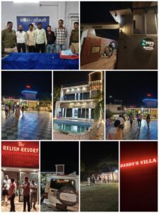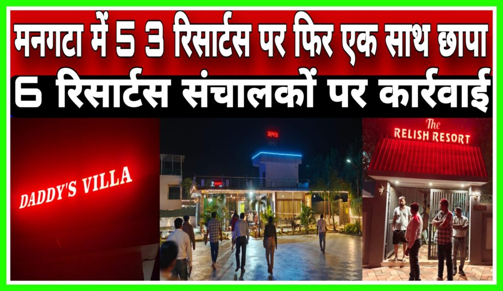 छापेमारी के दौरान लिलिपूट रिसॉर्ट, स्काई पुल रिसॉर्ट, एण्ड विला रिसॉर्ट, किम्बा फार्म रिसॉर्ट, क्लाउड नाईट रिसॉर्ट एवं फाईब्स रिसॉर्ट (मनगटा) के संचालक/मैनेजर द्वारा अपने रिसॉर्ट परिसर में आने-जाने वाले व्यक्तियों को शराब पीने की सुविधा उपलब्ध कराते हुए पाया गया।