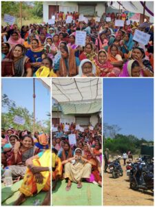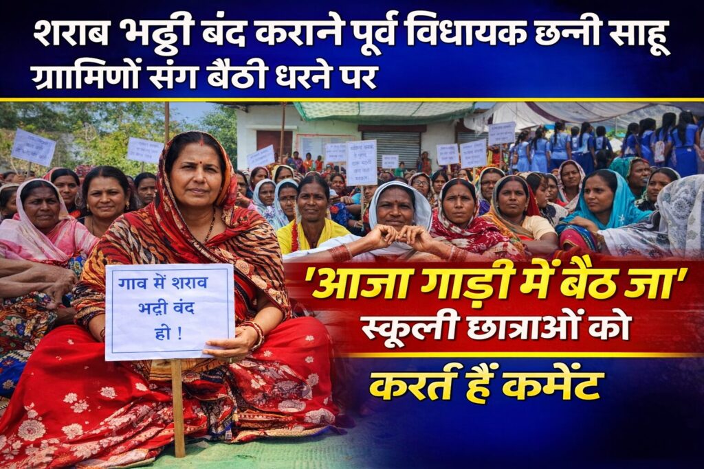 शराब भट्ठी बंद करने की मांग को लेकर पूर्व विधायक छन्नी साहू ग्रामीणों संग बैठी धरने पर।