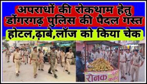 डोंगरगढ़–अपराधों की रोकथाम हेतु पुलिस अधिकारियों ने जवानों संग की पैदल गस्त।