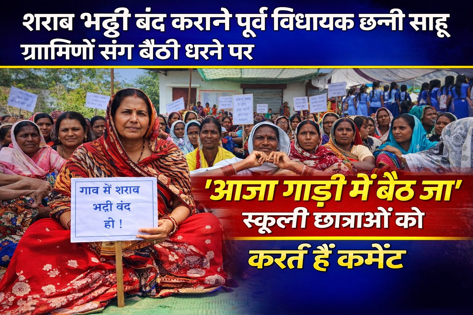 राजनांदगांव- शराब भट्ठी बंद करने की माँग को लेकर पूर्व विधायक छन्नी साहू ग्रामीणों संग बैठी धरने पर।